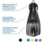 - Palmes réglables à design « Boot-Fit » intégrant une sangle élastique autoréglable et pouvant convenir à la plupart des pieds pour un enfilage et un retrait aisés.